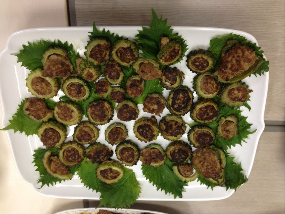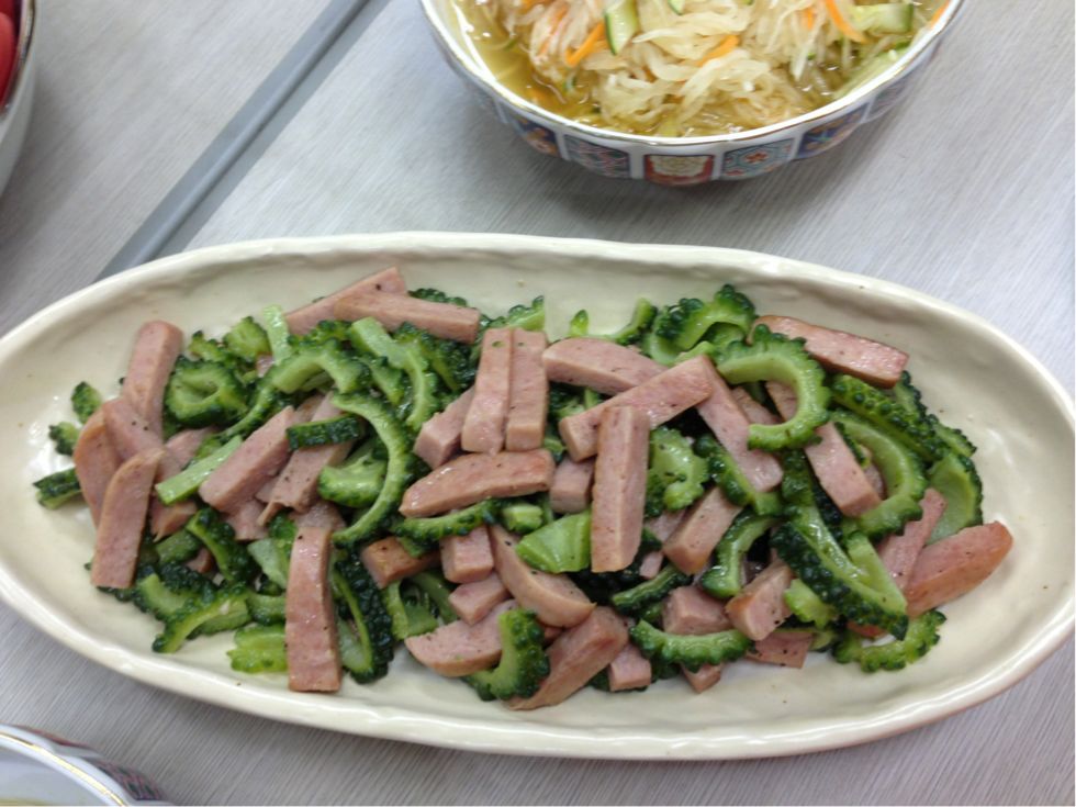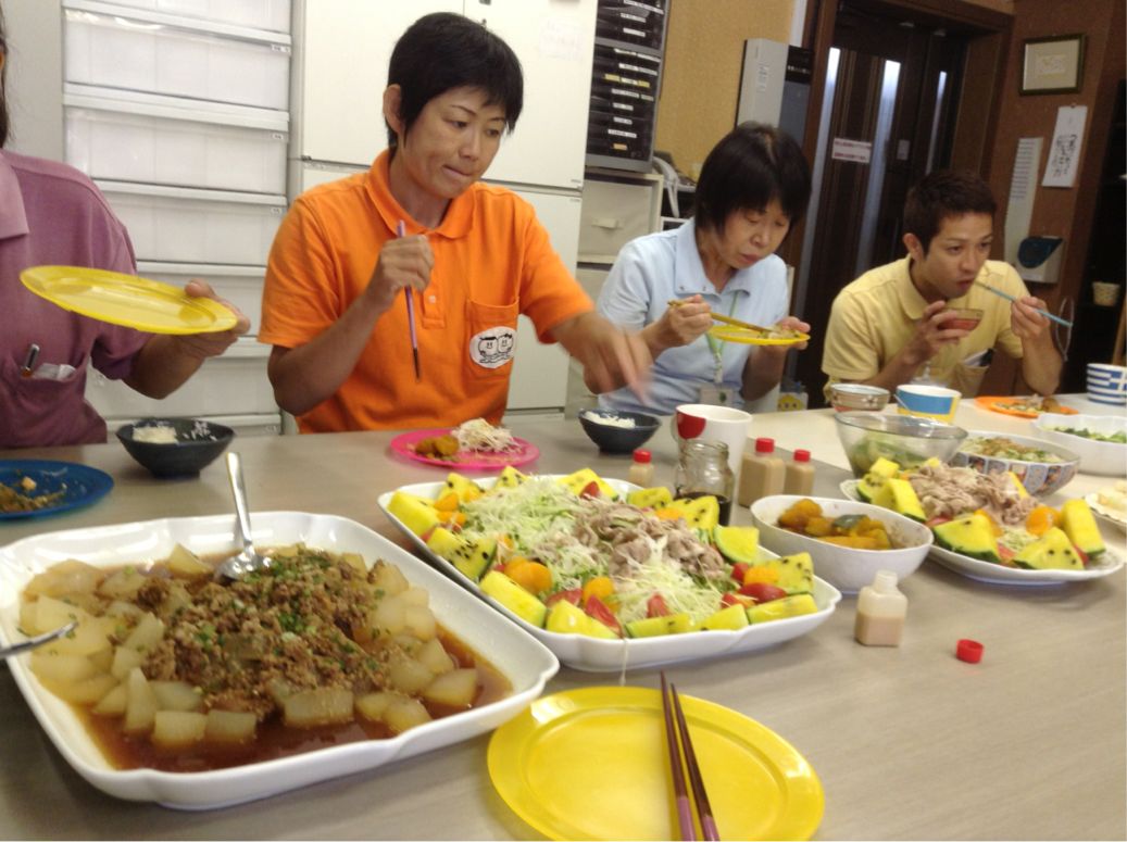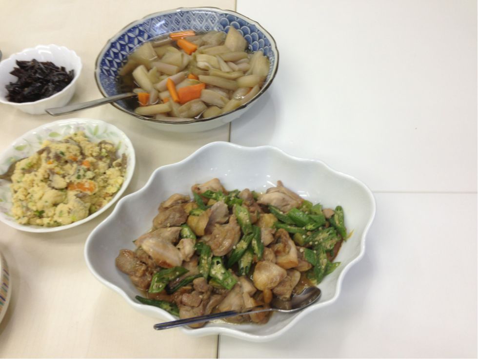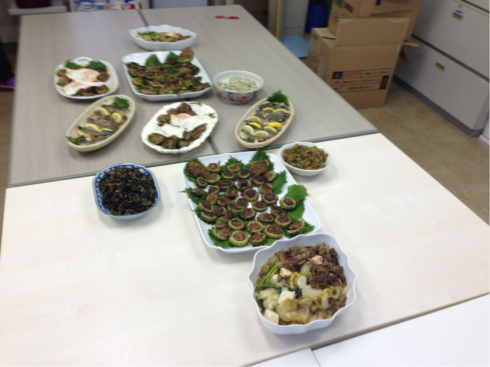 2013/08/09 Category : 普段的な料理 メインは ゴーヤハンバーグ この時期は農園でもゴーヤがいっぱい収穫できます。 利用者さん宅でグリーンカーテンの替わりにゴーヤを育てている方もいますよ♪ 今日のご飯は色合いが悪いよねぇ~ 茶色ばっかり(苦笑) 輪切りにしたゴーヤにハンバーグを詰めて焼きます 苦いのが苦手なスタッフもこれなら食べれる♪ すき焼きもどき(笑) アジの南蛮漬け 糸こんにゃく入りひじき 白和え じゃことピーマンの炒め物 なんだか、真上から撮ったら変な画像(笑) ミネストローネ風スープ♪